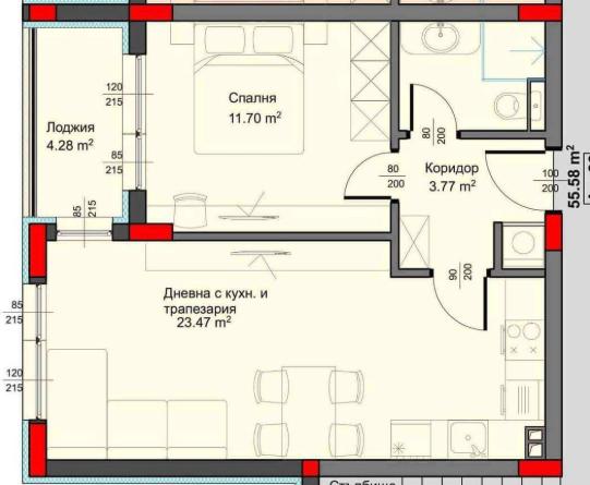 Имотът е разположен на 5-ти жилищен етаж, разполага с площ 63 кв.м., разгънати в следното разпределение: лоджия, хол с кухня и трапезария, спалня, коридор, баня с тоалетна
