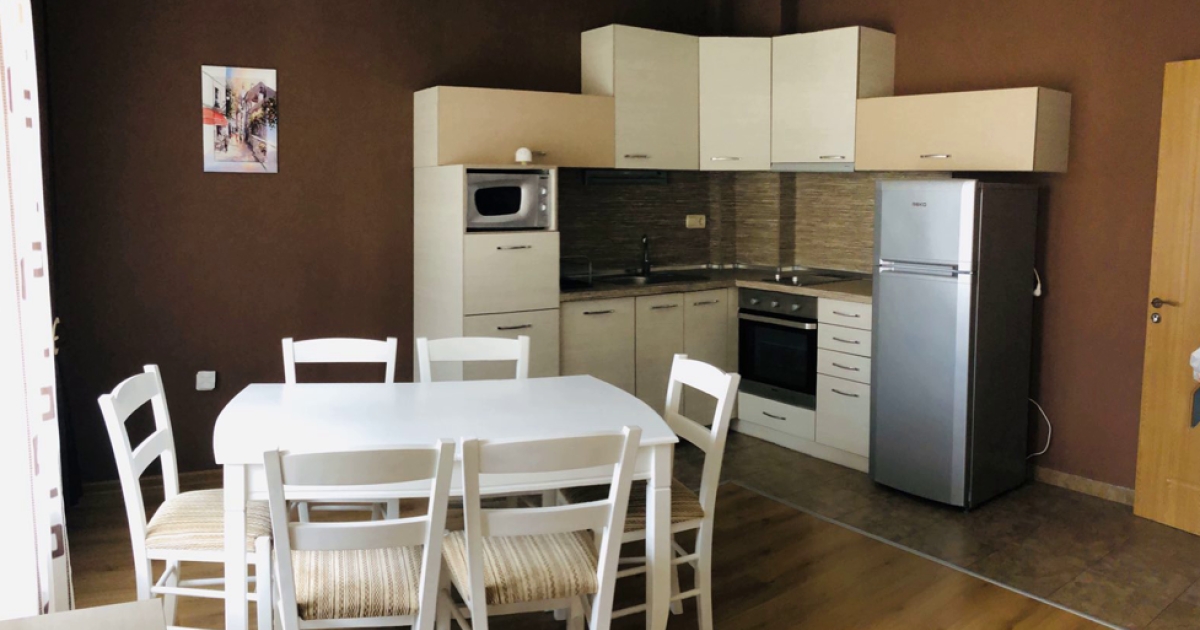 Имотът е ситуиран на 1-ви жилищен етаж и разполага със застроена площ от 56,07 кв.м., разгърната в следното практично разпределение: коридор, хол с кухненски бокс, спалня, баня с тоалетна, тераса, мазе.