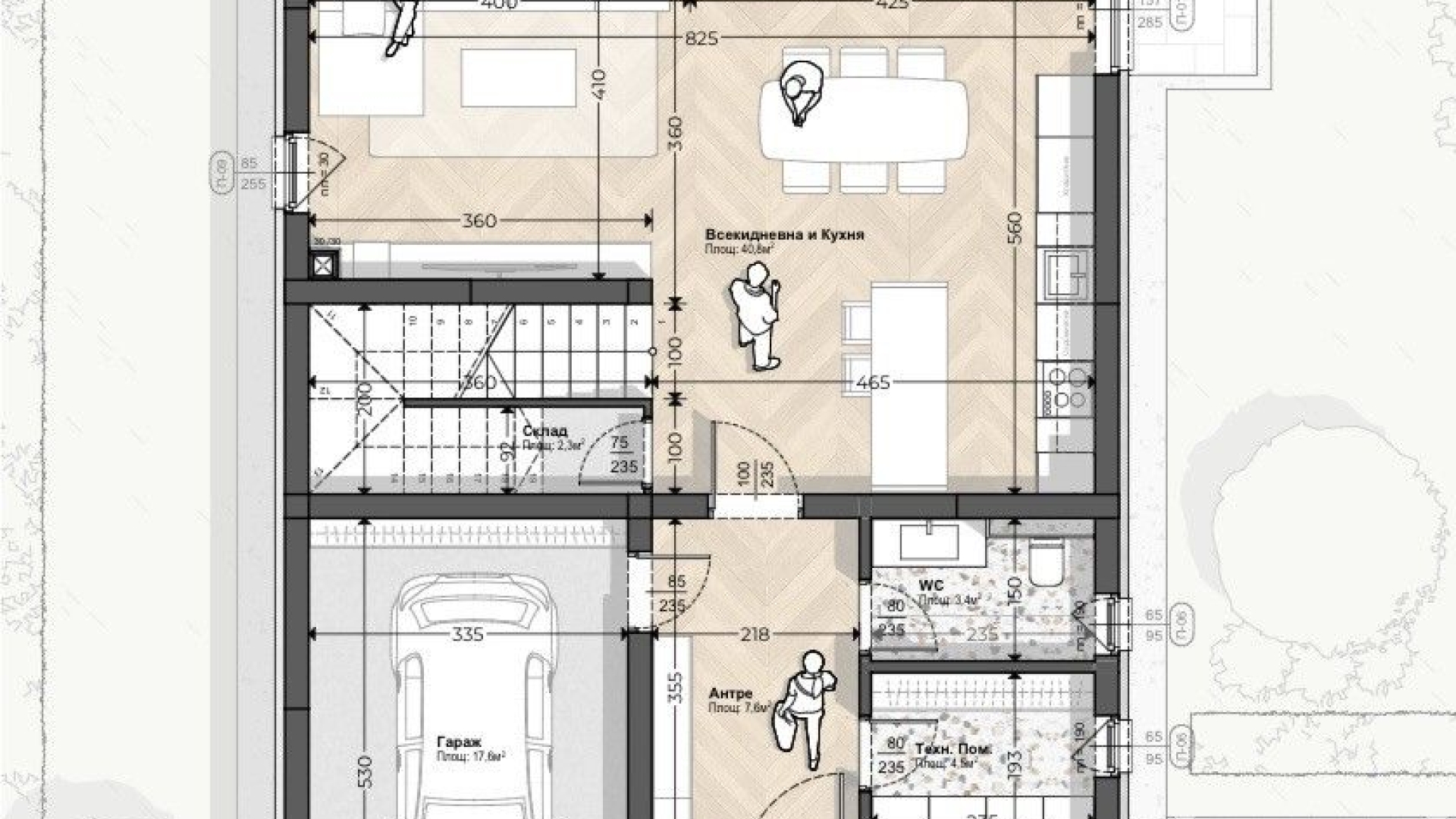 Първи етаж - входно антре, всекидневна с кухня, тоалетна, техническо помещение, покрита веранда + двор 210кв.м.