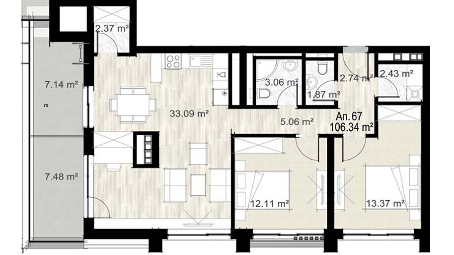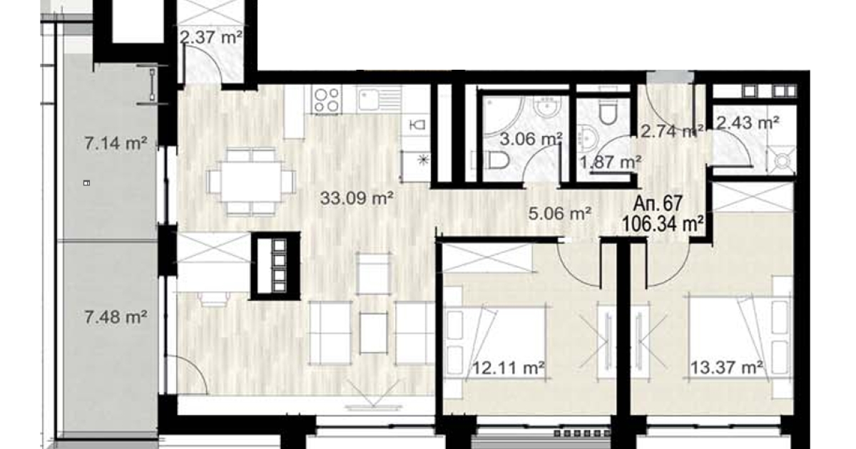 Апартамент 67Д е ситуиран на 13-ти жилищен етаж и разполага със застроена площ от 106,34 кв.м., разгърната по следния практичен начин: антре, дневна с трапезария и кухненски бокс, 2 спални, баня с тоалетна, отделна тоалетна, мокро помещение, складово помещение, тераса. Изложение: изток/север/юг.
