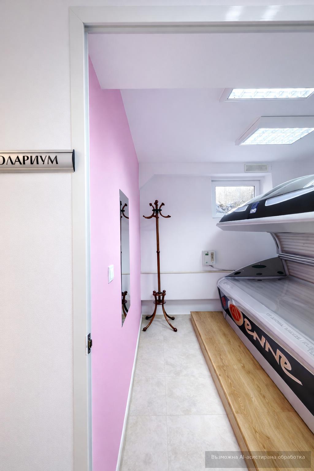 Сутерен – 100 кв.м. : 2 самостоятелни стаи за козметични процедури, солариум, обособена зона за педикюр, 2 масажни стаи, тоалетна и баня с тоалетна.
