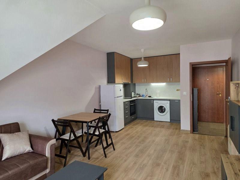 Разпределението включва входно антре, баня с душ и отделна тоалетна, дневна с кухненски бокс, спалня и балкон. Обзаведен е с всички необходими мебели и електроуреди, отоплява се на газ и разполага с климатици за допълнителен комфорт.