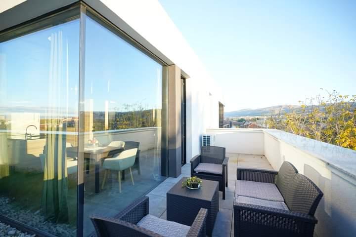 Жилището с площ 120 кв.м. се намира на 4-ти етаж в нова четириетажна сграда. С изложение Запад/Юг и голяма озеленена тераса, помещението предлага простор и комфорт.
