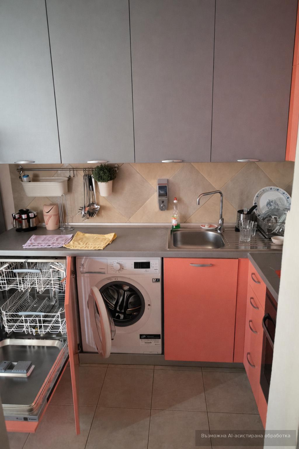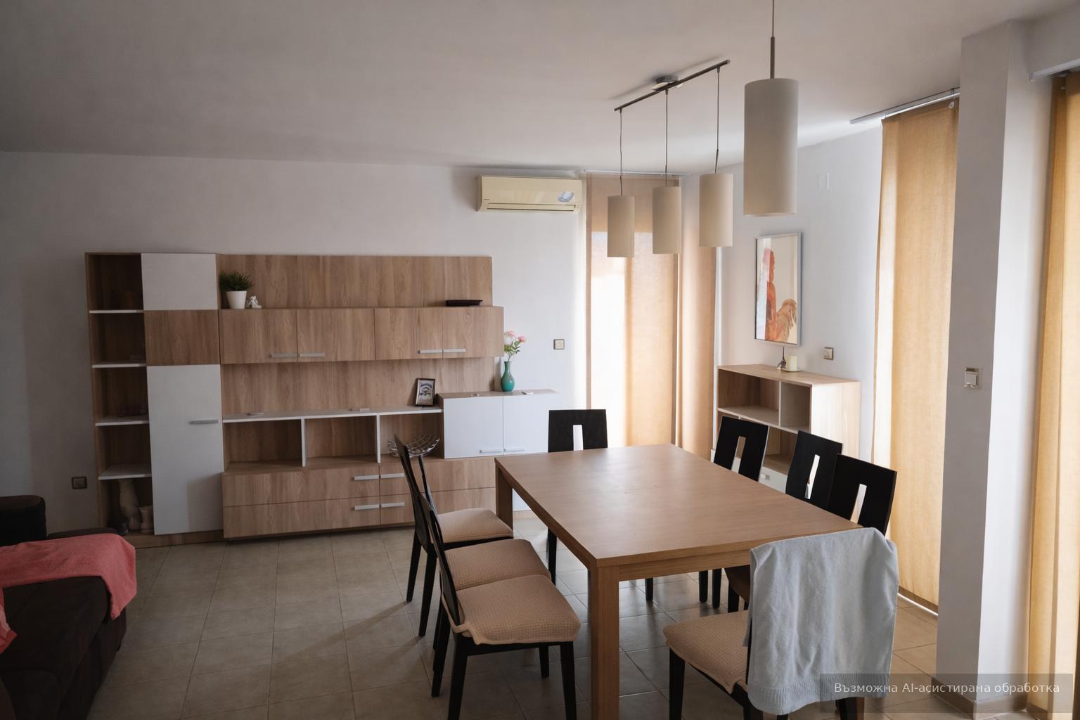 Прецизният подбор на мебели и материали подчертава съвременния характер на интериора, а функционалният кухненски кът е оборудван с необходимите уреди.