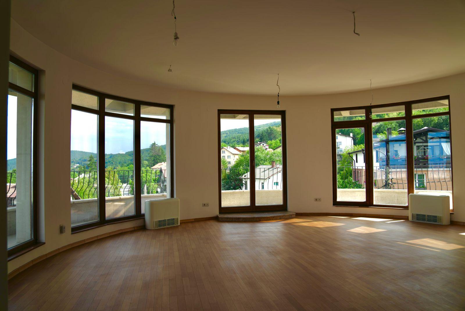 Апартаментът е разположен на четвърти жилищен етаж в сграда с Акт 16 от 2014г. Разполага с площ от 155 кв.м. Разпределението както следва е : коридор , прсторна дневна с трапезария и кухненски бокс , две спални , баня с тоалетна,тоалетна и тераса.Отоплението е на газ.