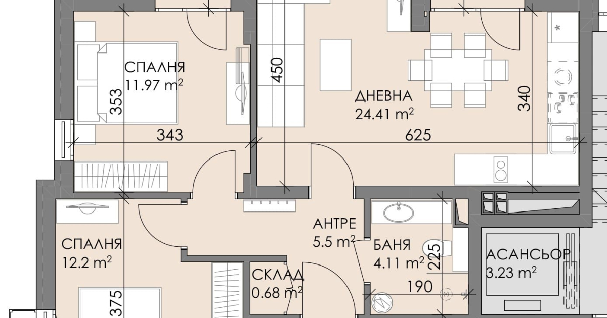 Сградата е с монолитна стоманобетонна конструкция. Апартаментите ще бъдат завършени по БДС: