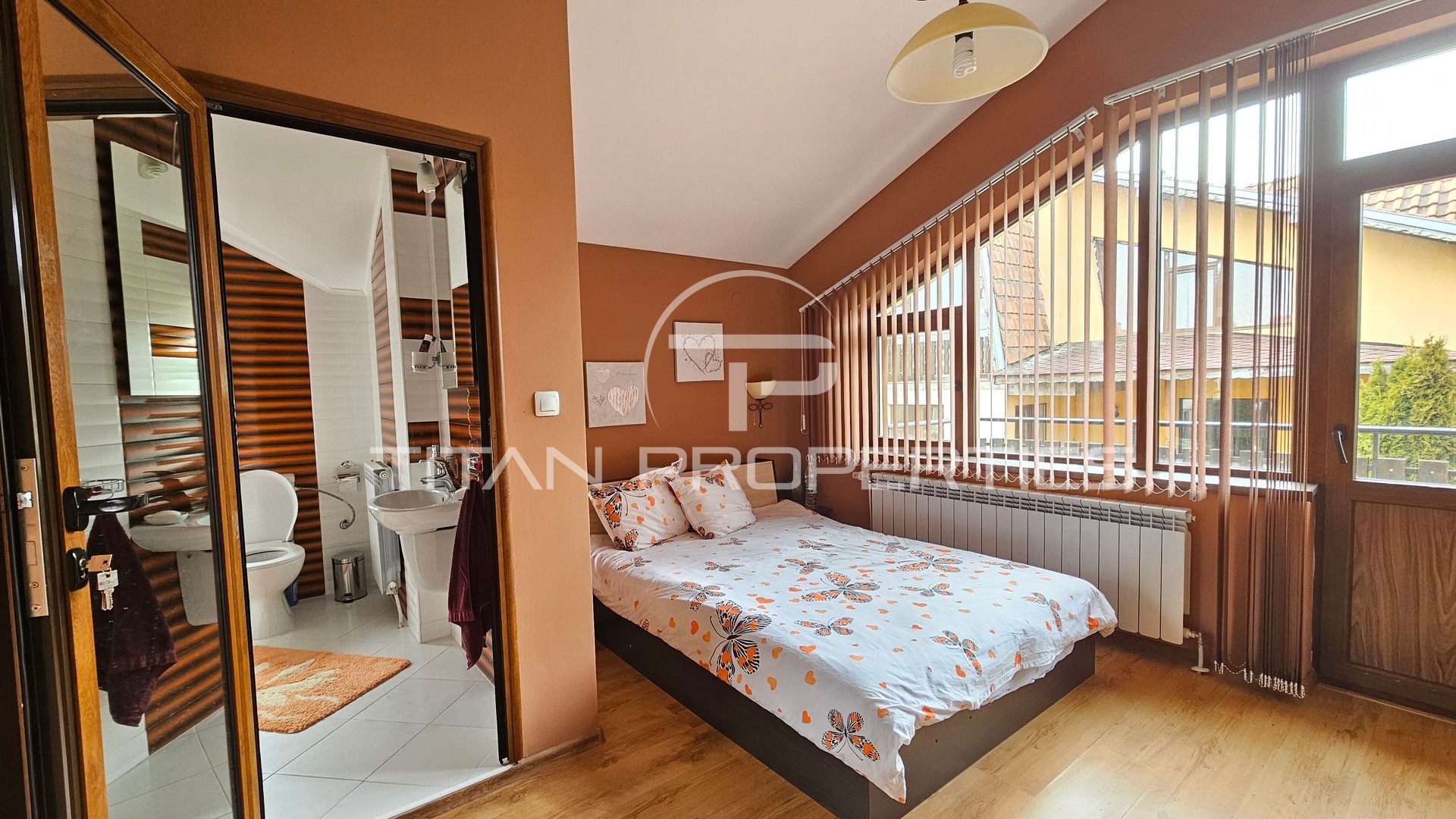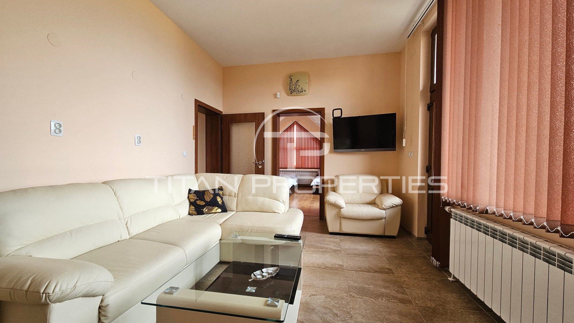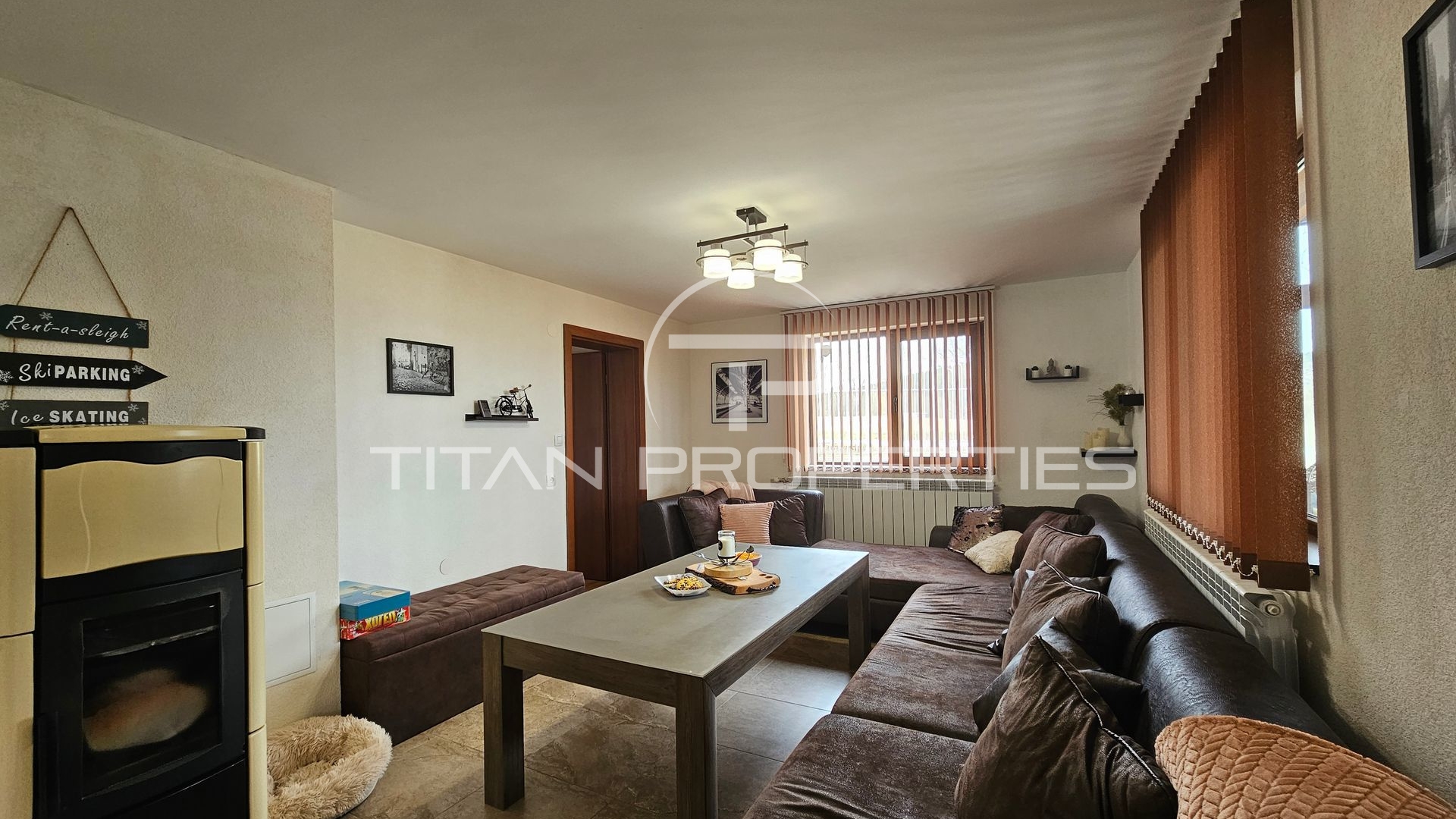 Хол с мека мебел, три спални (едната със собствена баня и тоалетна), още една баня с тоалетна, две тераси и външно стълбище с отделен вход, което позволява удобно използване на двата етажа.