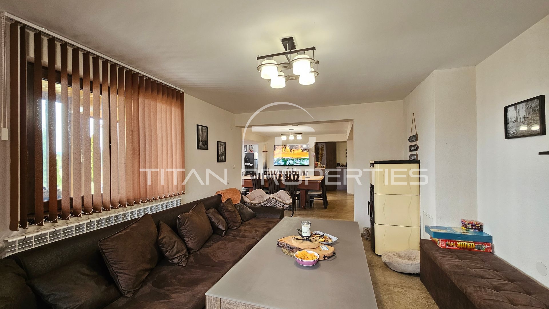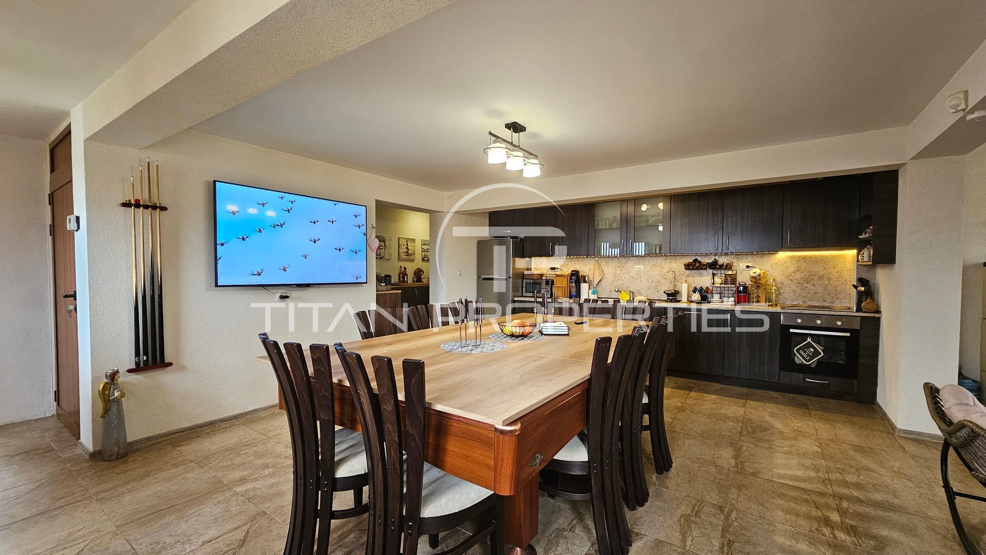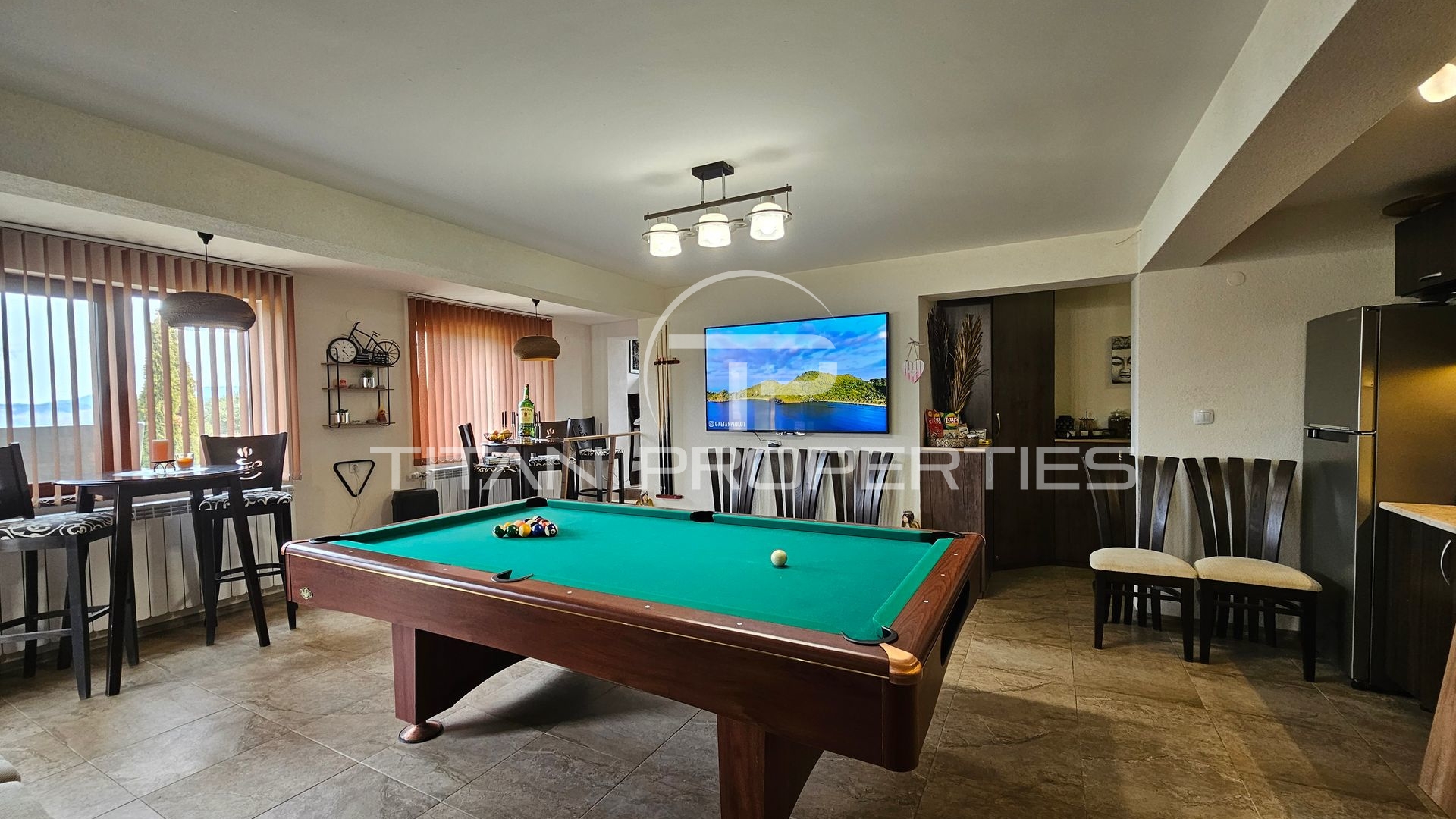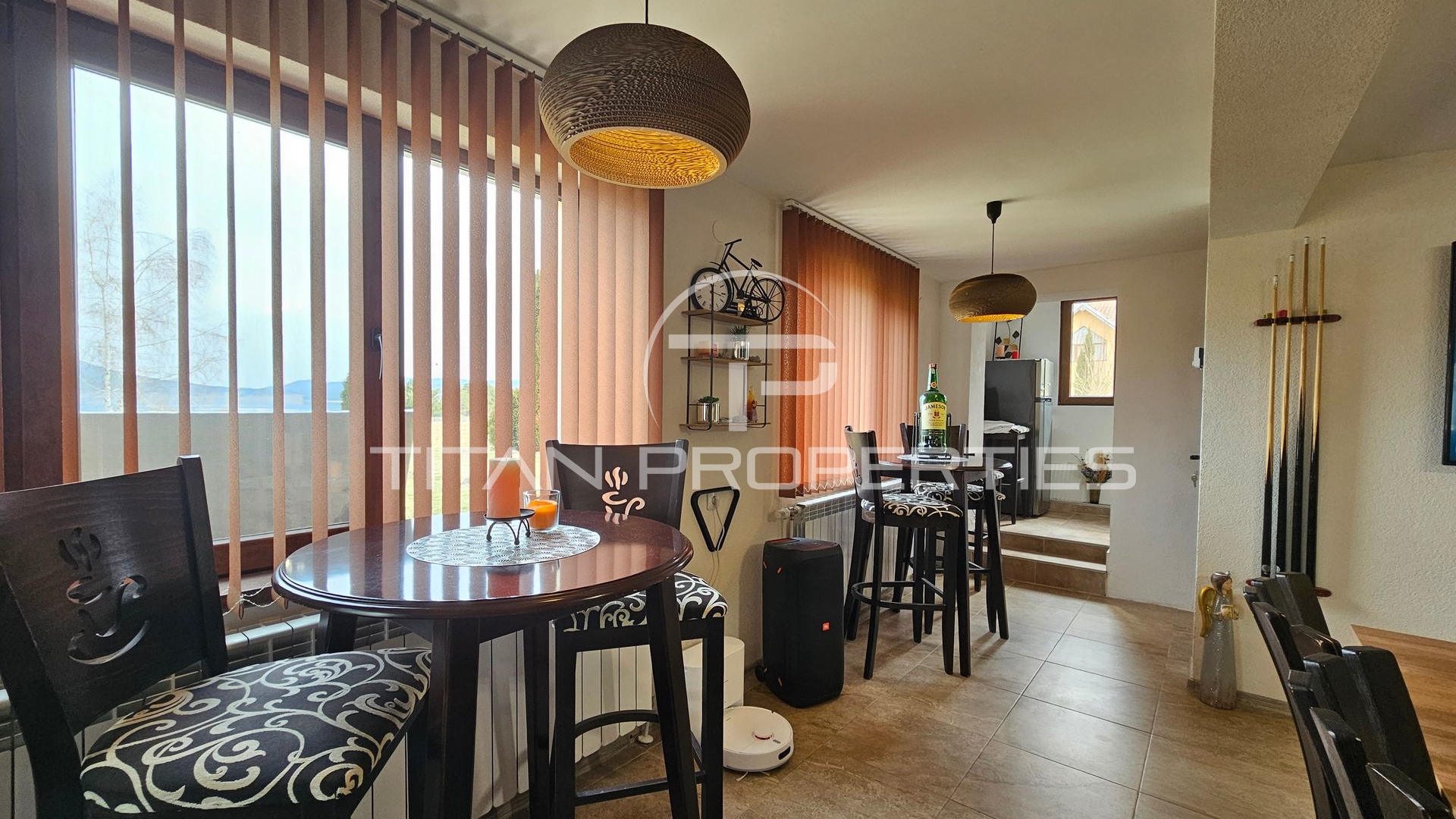 Просторна дневна с кухня и трапезария, билярдна маса, спалня, голяма баня с тоалетна със сауна и джакузи, както и просторна веранда.