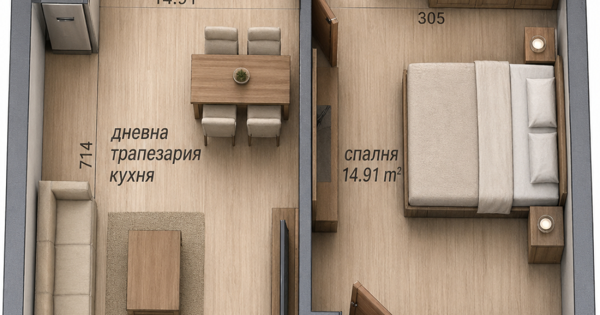 Имотът е ситуиран на 1-ви жилищен етаж и разполага с площ 71кв.м. разгърната в следното разпределение: входно антре, дневна с кухненски бокс и трапезария, спалня, килер, баня с тоалетна и тераса.