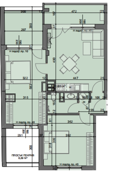 2 спални, баня с тоалетна, мокро помещение, 2 тераси.