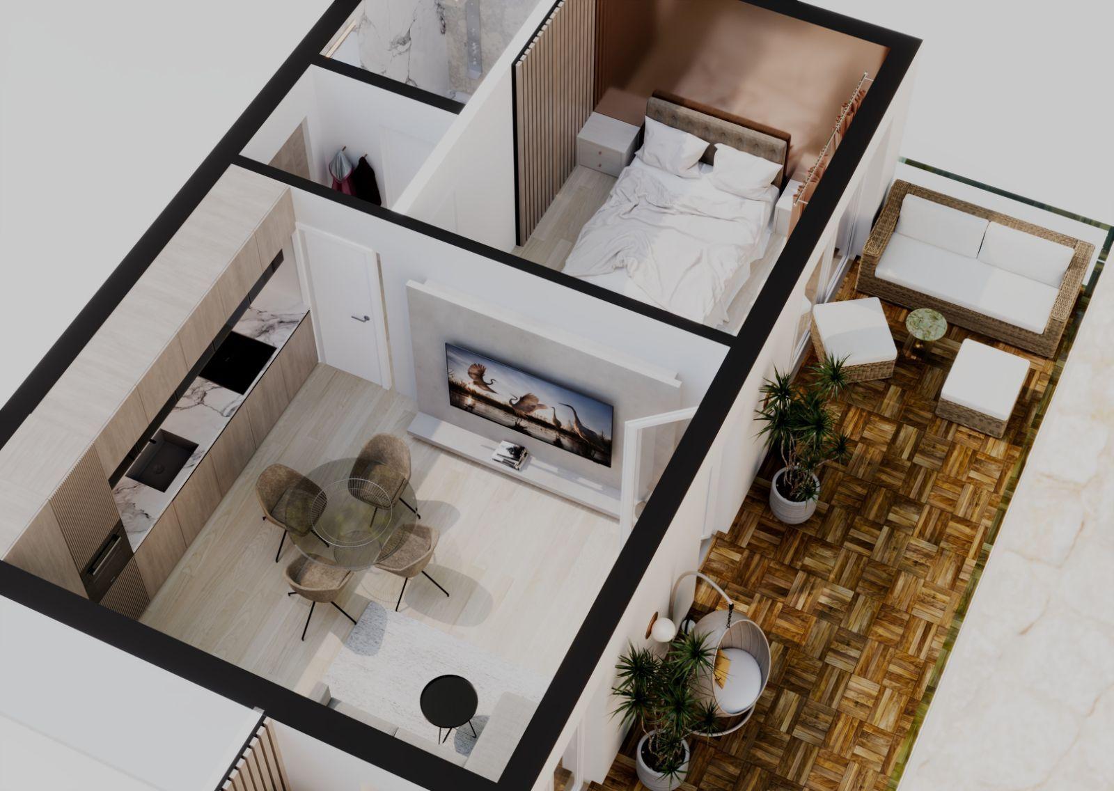 Разпределението на имота включва дневна с кухненски бокс, спалня с директен излаз към терасата и баня с тоалетна.
