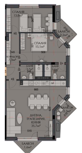 Жилището с площ 125.12 кв.м. е разположено на 3-ти етаж в нова шест етажна сграда, като разпределението му включва: антре, баня с тоалетна, мокро помещение, хол с кухненски бокс и тераса, спалня и втора спалня със собствена баня и тераса.