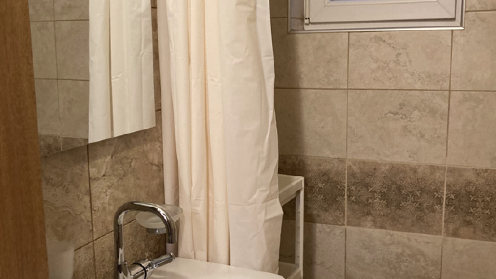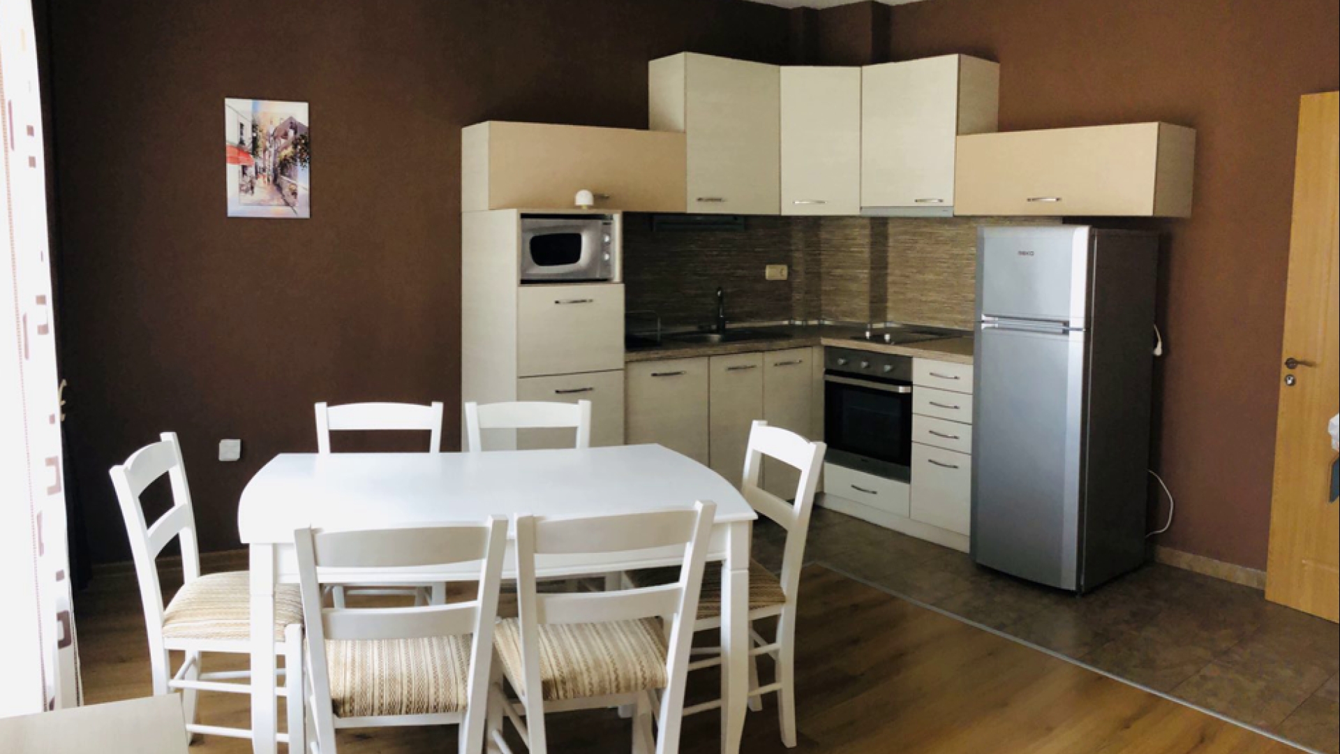 Имотът е ситуиран на 1-ви жилищен етаж и разполага със застроена площ от 56,07 кв.м., разгърната в следното практично разпределение: коридор, хол с кухненски бокс, спалня, баня с тоалетна, тераса, мазе.