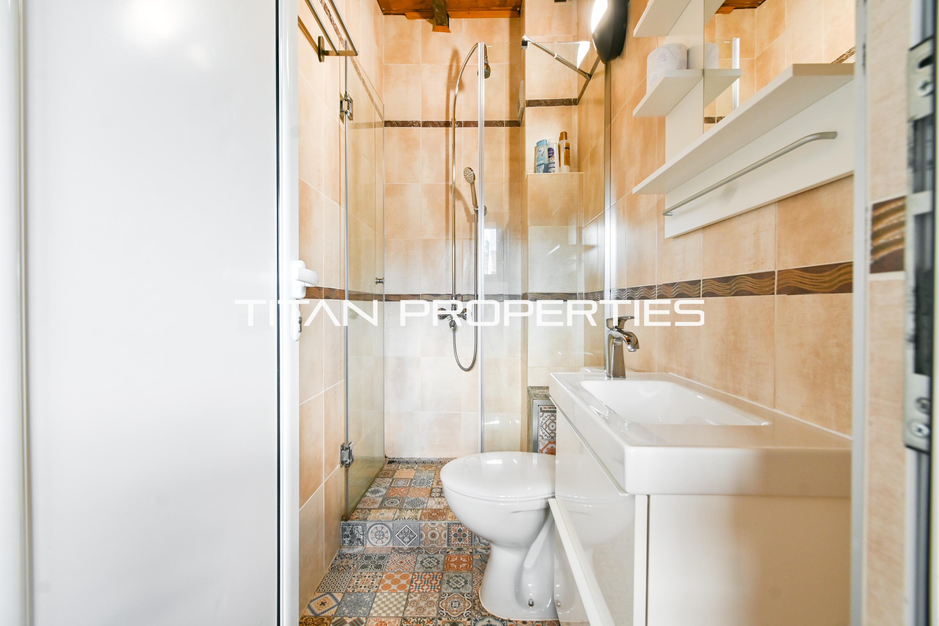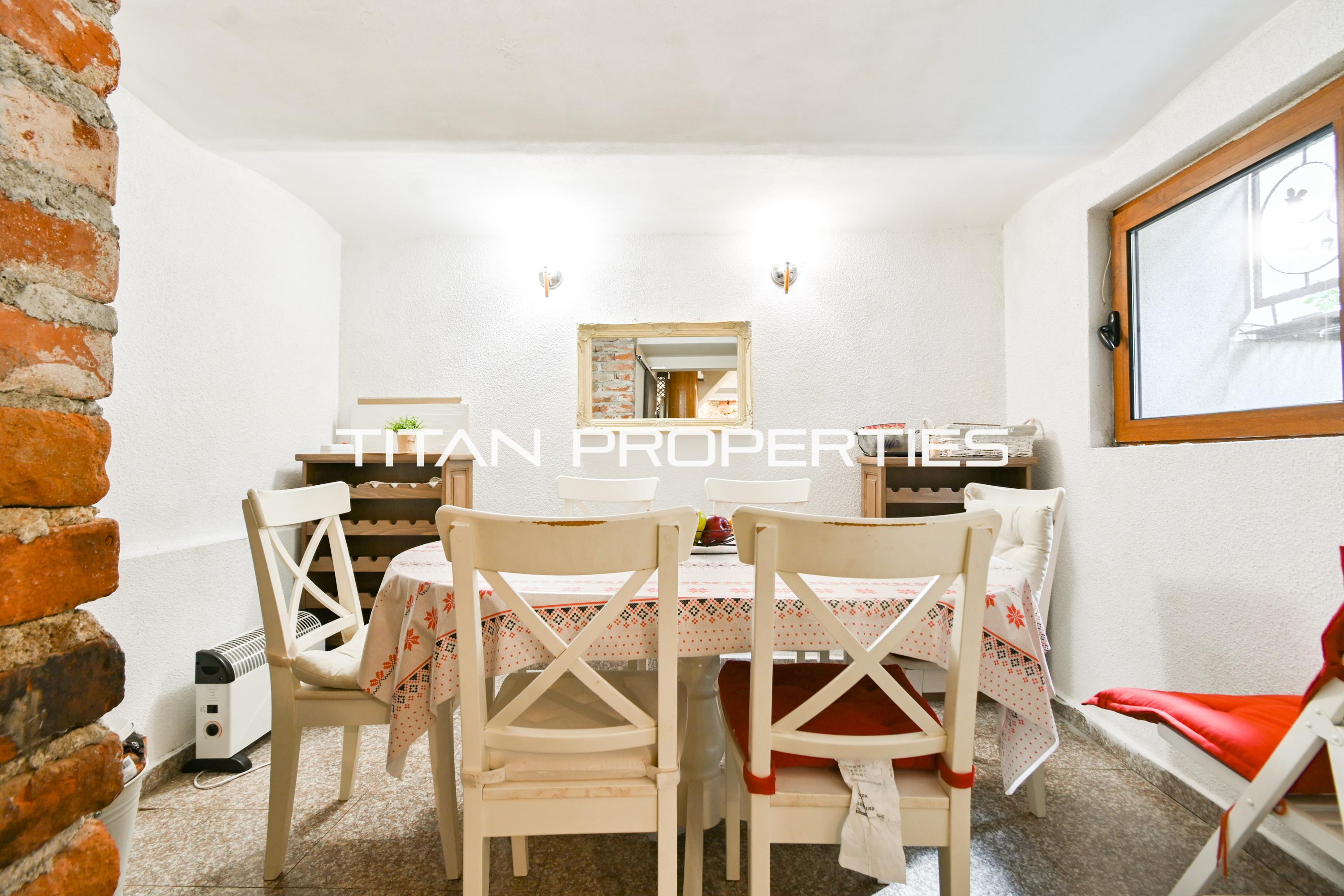 Титан Пропъртис - офис Хиподрума с радост предлага на Вашето внимание къща за продажба в Център-ЦУМ, София. Жилището с обща площ 143 кв.м. се простира в сутерен и три етажа от тухлена конструкция. Изложението Изток/Запад/Север/Юг гарантира изобилие от светлина във всички стаи. В сутерена е поместена просторна кухня с трапезария. На първи етаж се намира спалня с баня и тоалетна, допълнителна кухня и веранда. Вторият етаж включва две спални с баня и тоалетна, както и тераса, а на третия – още две спални с тоалетна. Имотът е с отопление на електричество.