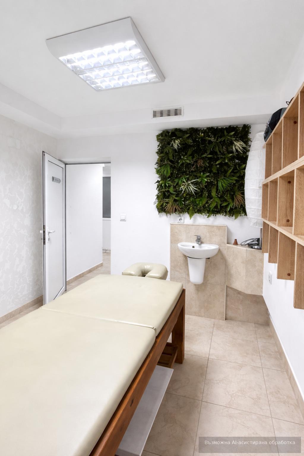 Сутерен – 100 кв.м. : 2 самостоятелни стаи за козметични процедури, солариум, обособена зона за педикюр, 2 масажни стаи, тоалетна и баня с тоалетна.