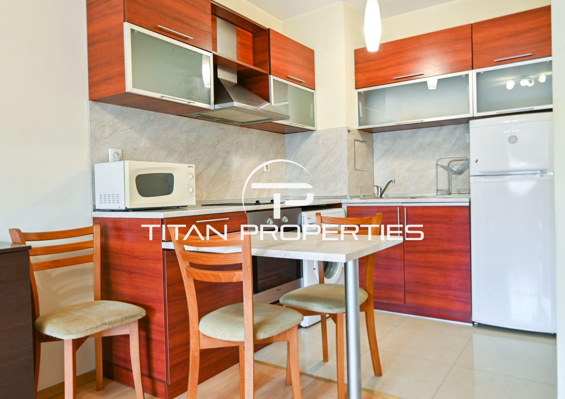 Разпределението включва комфортна спалня и просторен хол с кухненски бокс. Апартаментът е обзаведен със съвременно оборудване и разполага с ТЕЦ отопление и климатик.