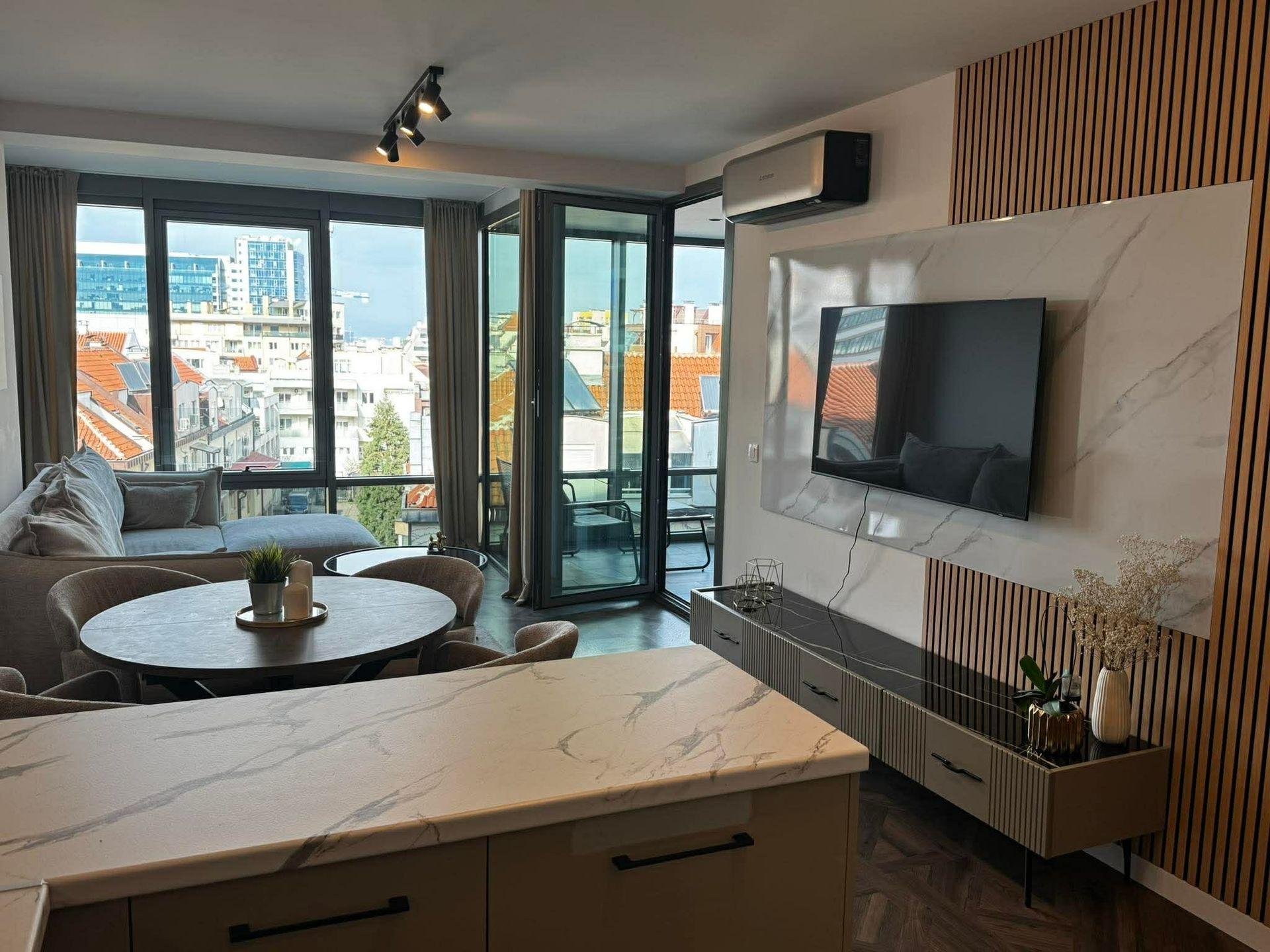 Обзаведен и оборудван с климатик и газово отопление, апартаментът предлага интернет окабеляване и луксозни довършителни работи. Месечният наем е 1000 EUR.