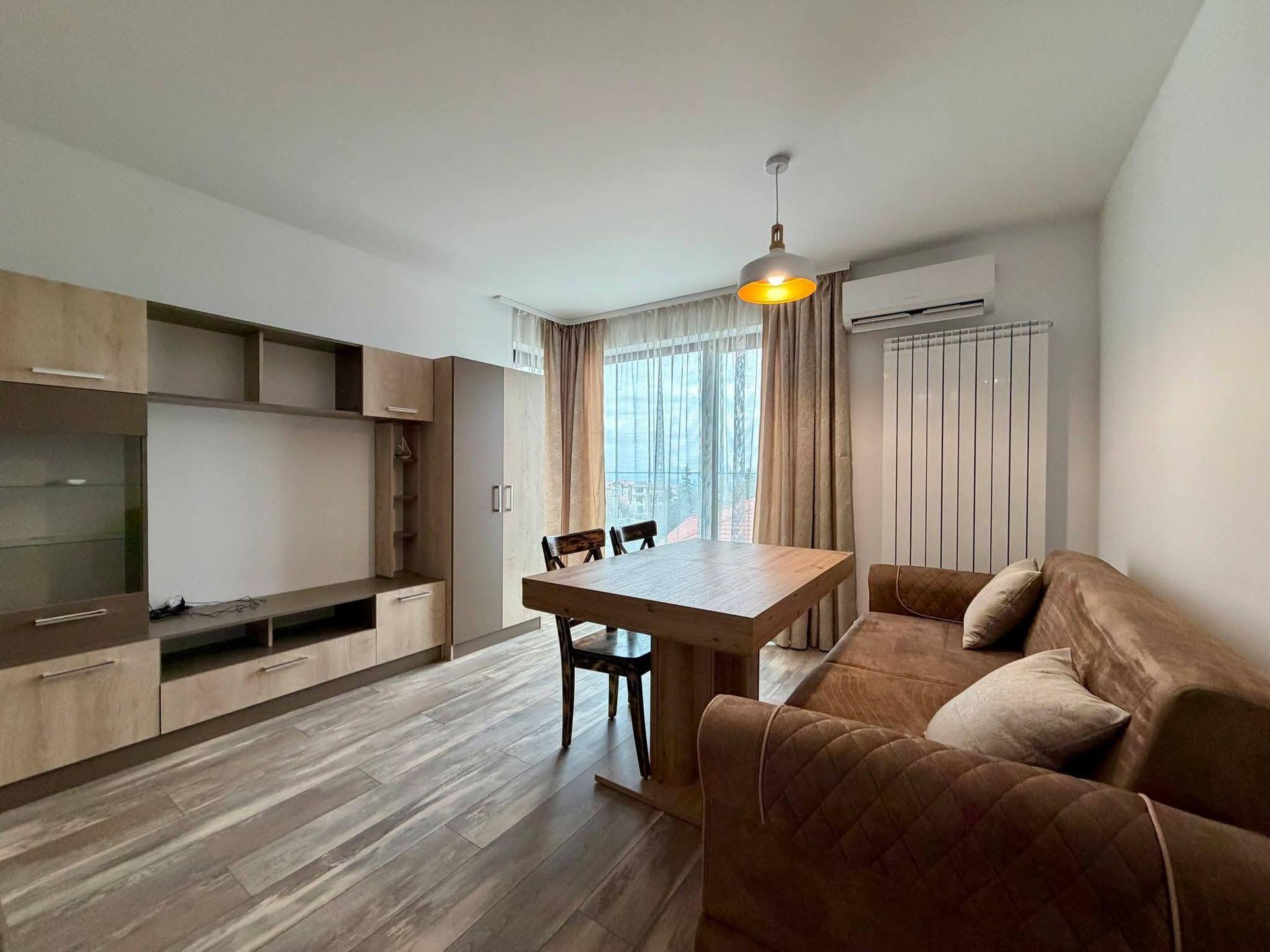 Разпределението включва хол с кухненски бокс, спалня, баня с тоалетна и тераса. Апартаментът е обзаведен и разполага с отопление на ток, което осигурява умерени месечни разходи. Месечният наем е 650 EUR.