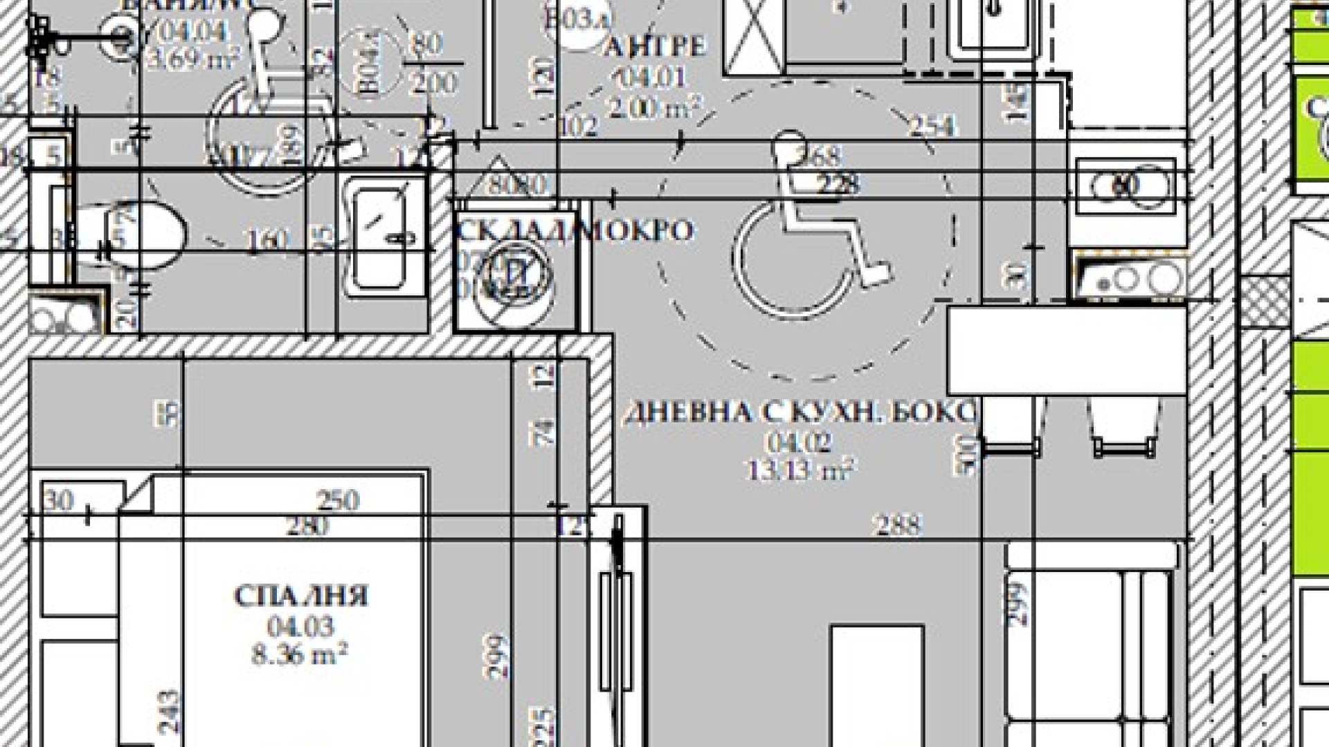 Имотът е ситуиран на 1ви жилищен етаж и разполага с площ 46,64 кв.м, разгърната в следното разпределение: входно антре, хол с трапезария и бокс кухня, спалня, баня с тоалетна.