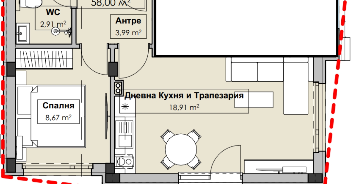 Предлаганият от нас апартамент е ситуиран на 1-ви жилищен етаж и разполага с площ от 58 кв.м разгърнати в следното практично разпределение: входно антре, хол с кухня и трапезария, спалня, баня с тоалетна, тераса.