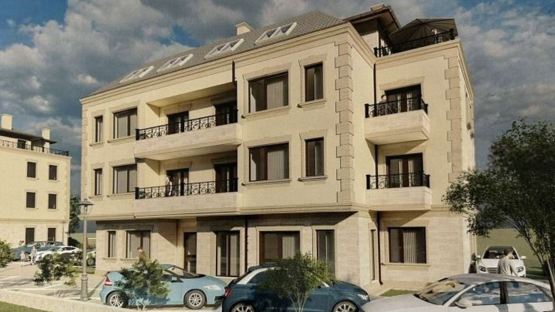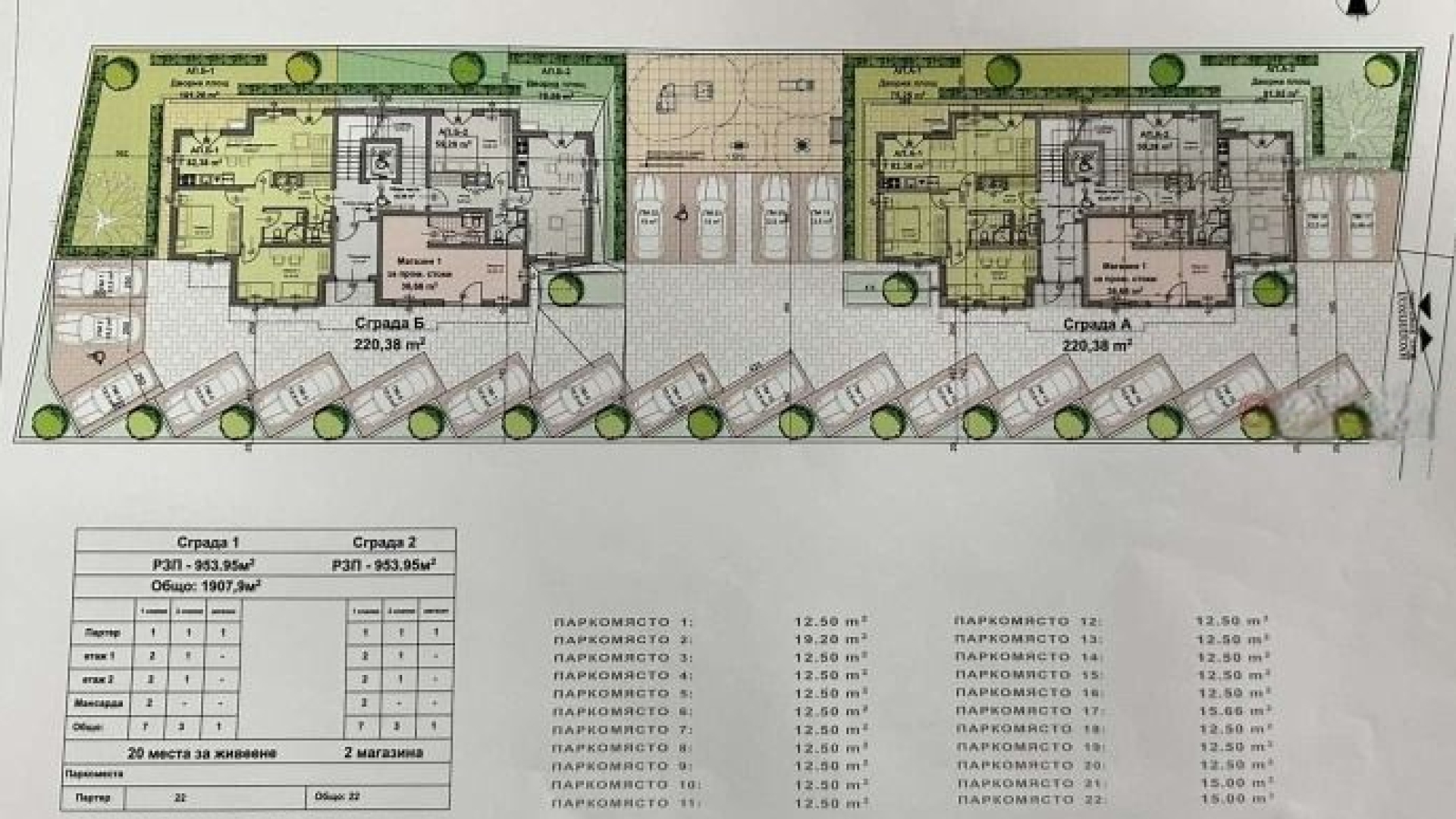 Имота е равен с проект за 2 броя жилищни сгради - 20 апартамента 2 магазина и 22 паркоместа.